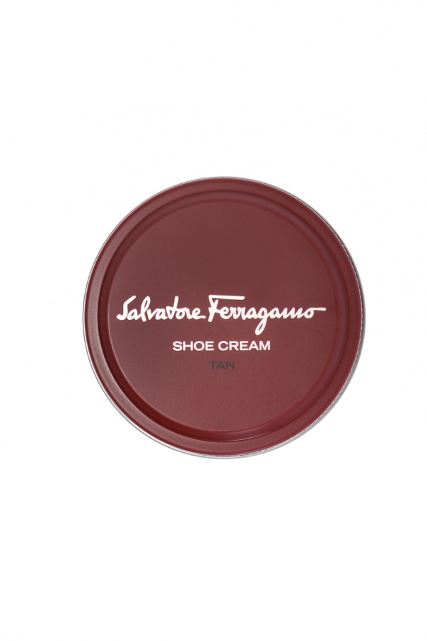 Brown shoe polish in a branded container from Salvatore Ferragamo .