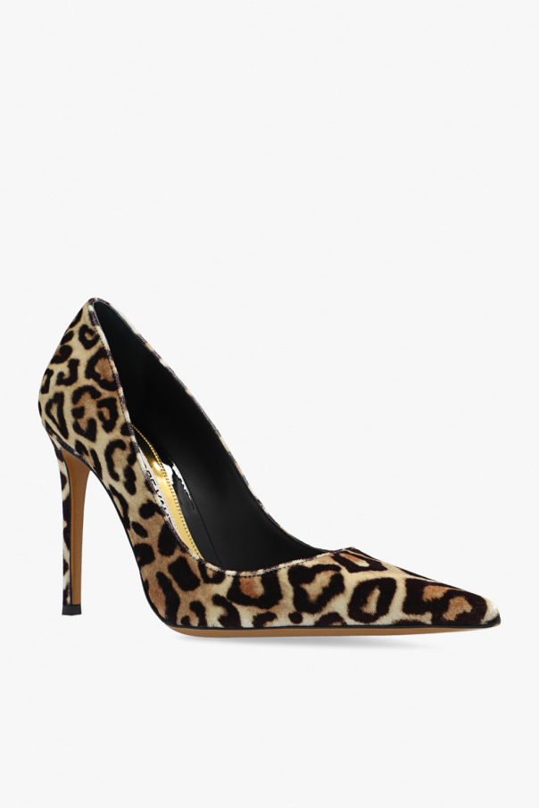 Cream, brown and beige ‘Alex’ velvet stiletto pumps from Alexandre Vauthier. Embellished with an animal pattern, this model features a pointed toe silhouette set on a light brown leather sole.