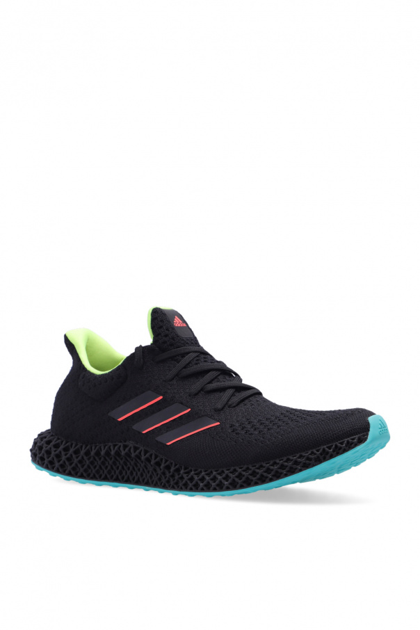 Black ‘4D Futurecraft’ running shoes from ADIDAS Performance, the ‘End Plastic Waste’ line. Crafted partially from recycled materials, this lace-up model features a PRIMEKNIT upper to ensure proper fit, a logo appliqué on the tongue, the brand's signature black and orange three stripes on the sides, a 4DFWD midsole, which absorbs impact and translates vertical impact forces from a runner’s downward step into forward momentum, and a blueish-green Continental™ rubber outsole.