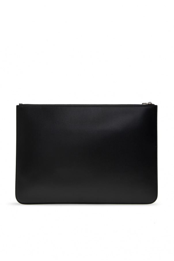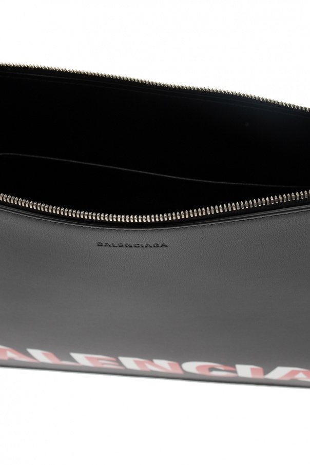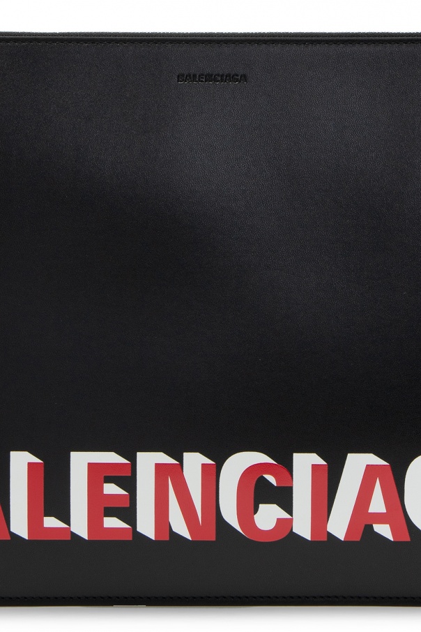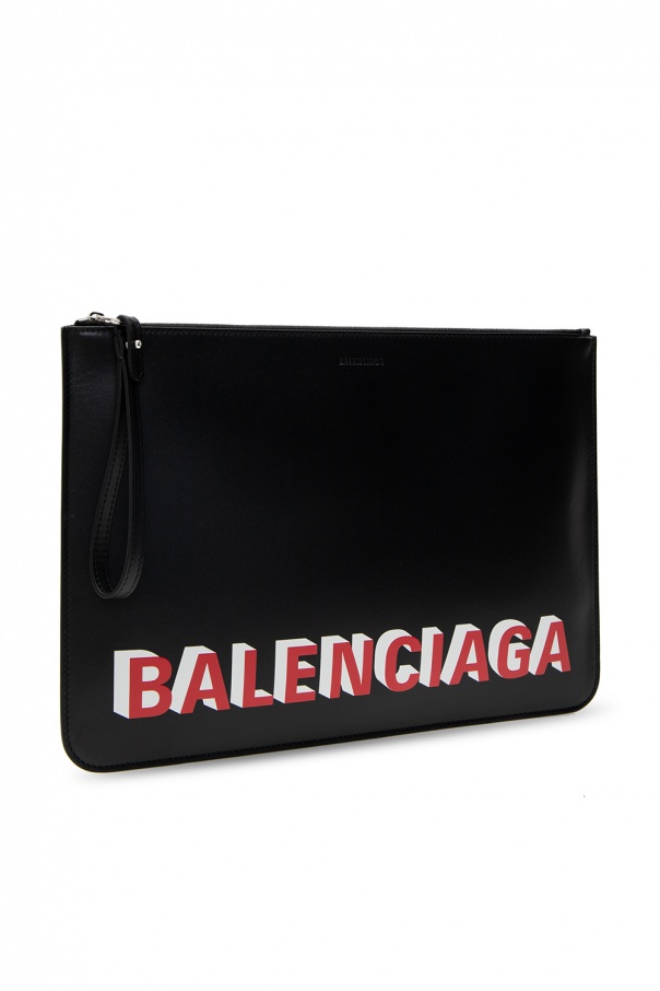 Black clutch from Balenciaga. Crafted from calf leather, this item fastens with a zip and is complete with an embossed logo detail, red and white logo print, a wrist strap and one internal compartment with one slip pocket inside.