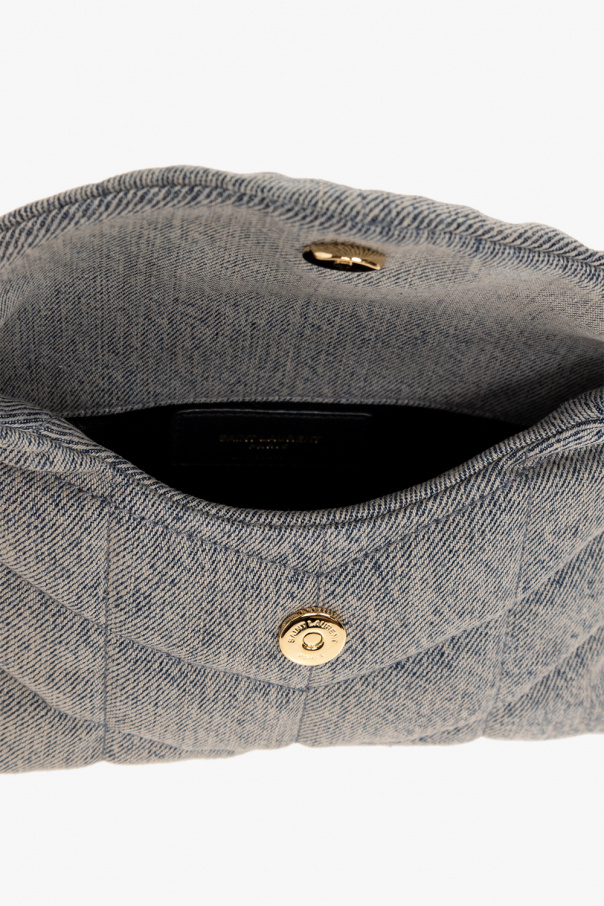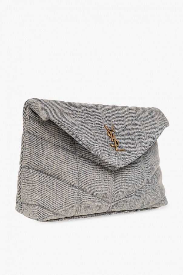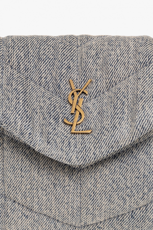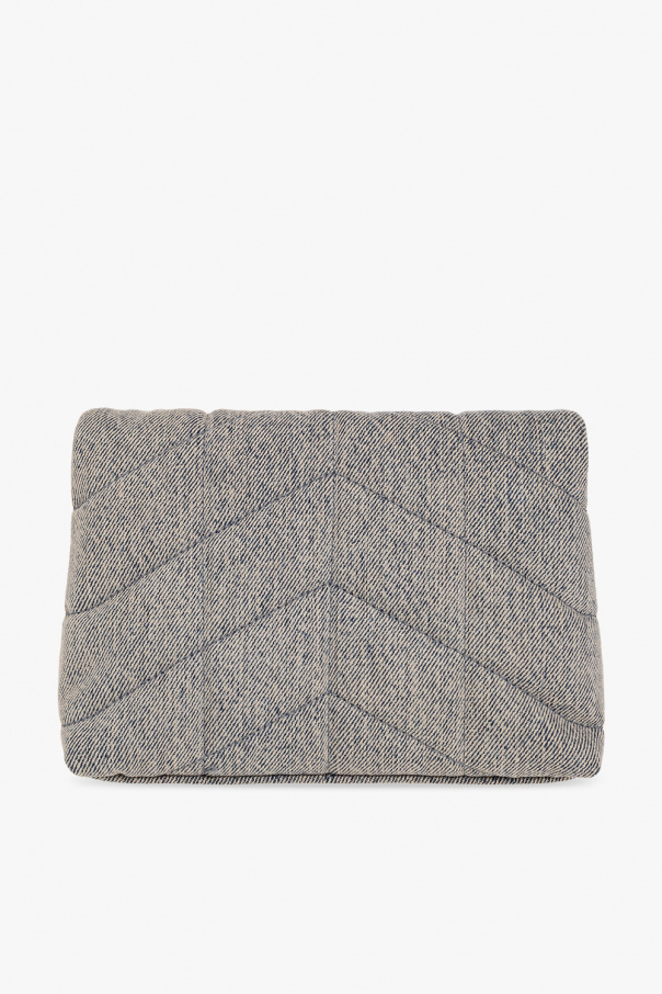 Grey and blue ‘Puffer Small’ quilted handbag from Saint Laurent. Crafted from cotton, this design secures with a magnetic snap and features a metal logo plaque on the front, gold-tone metal hardware and one internal compartment with a removable zip card case in black leather.