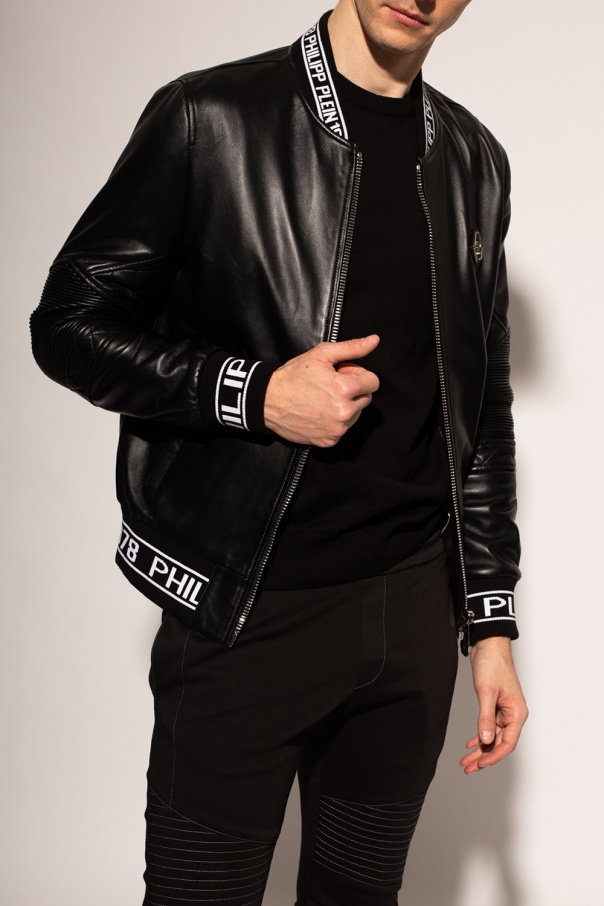 Black bomber jacket from Philipp Plein. Crafted from sheep leather, this long-sleeved garment features a zip fastening, black patch with a silver-tone logo, two slip pockets and ribbed trims in black enriched by a white logo at the collar, hem and cuffs.