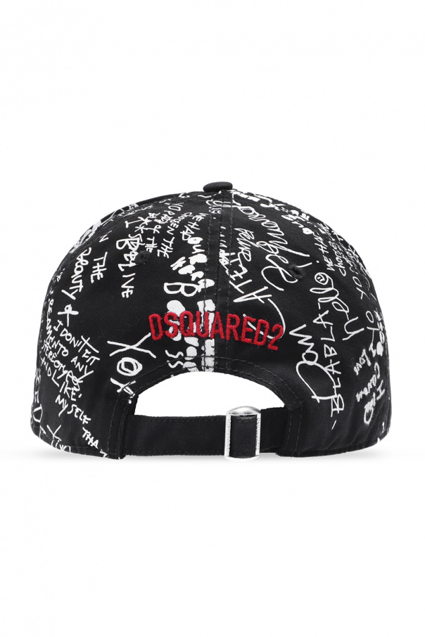 Black baseball cap from Dsquared2. Made of cotton, this garment features printed and embroidered lettering in white, a red logo embroidery and adjustable buckle strap at the back.