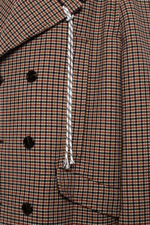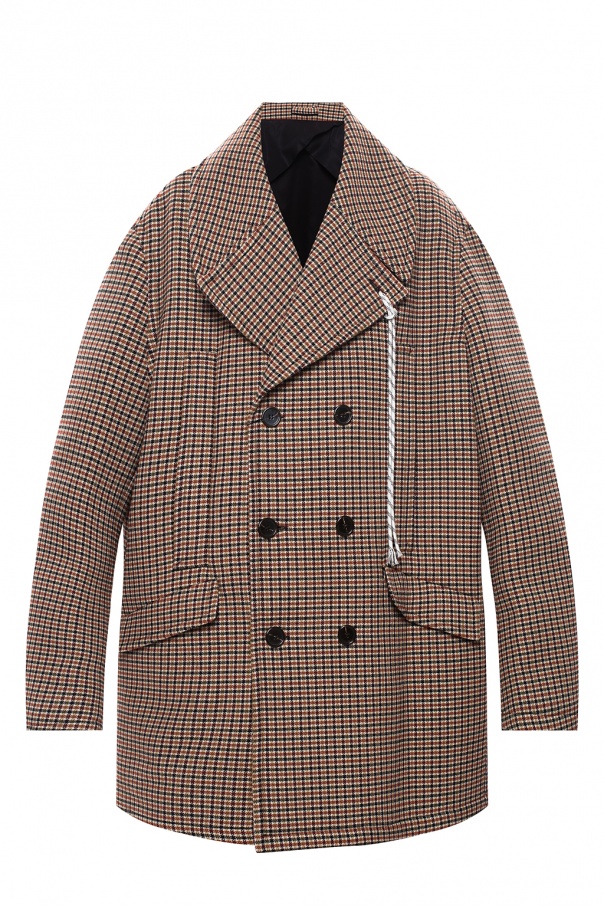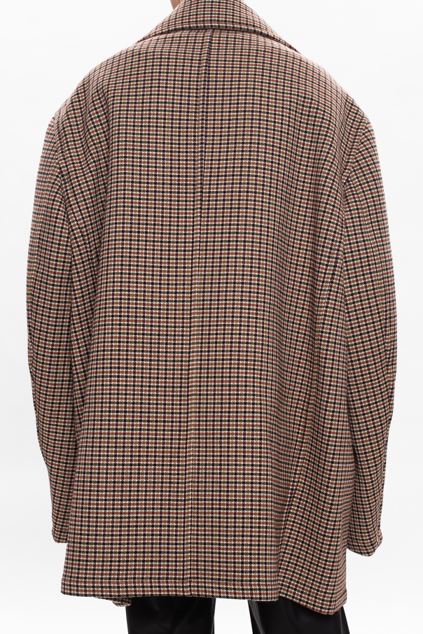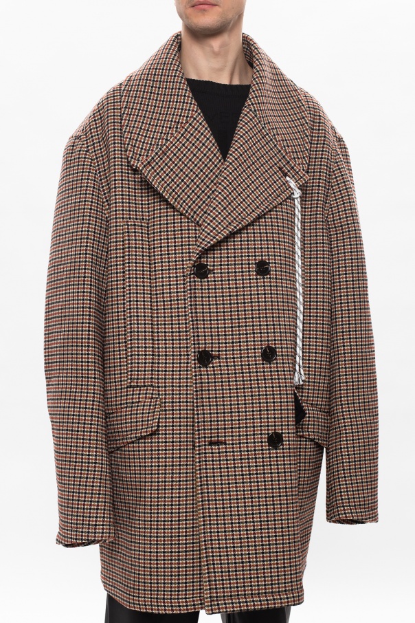 Black and brown coat from Raf Simons, the ‘Archive Redux’ collection. Boasting a double-breasted silhouette in checked pattern, this style features button closures, two flapped pockets and notched lapels. ‘Archive Redux’ is a cherry-picked reissue of 100 iconic pieces from Simons' archive to celebrate the 25th anniversary of his eponymous brand.