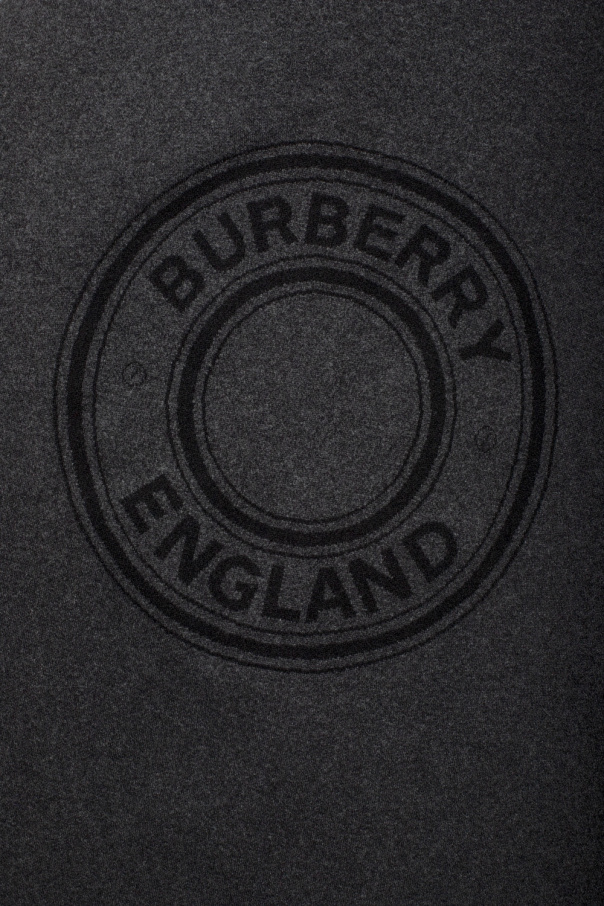 Dark grey ‘Carla’ hooded poncho from Burberry. Made of a wool and cashmere blend, this garment features a black logo embroidery, two slip pockets and sleeves with dark grey and black ribbed cuffs with slits.