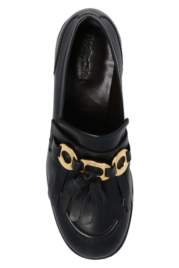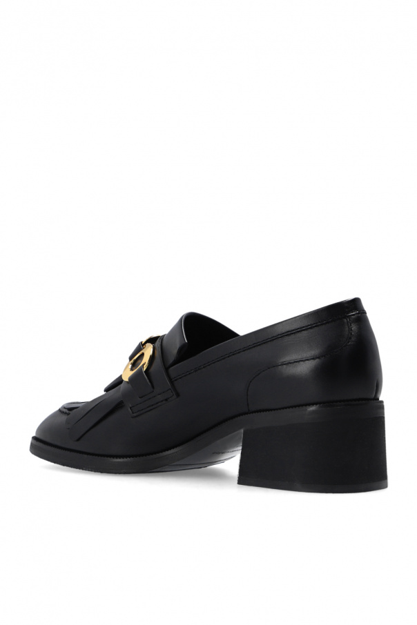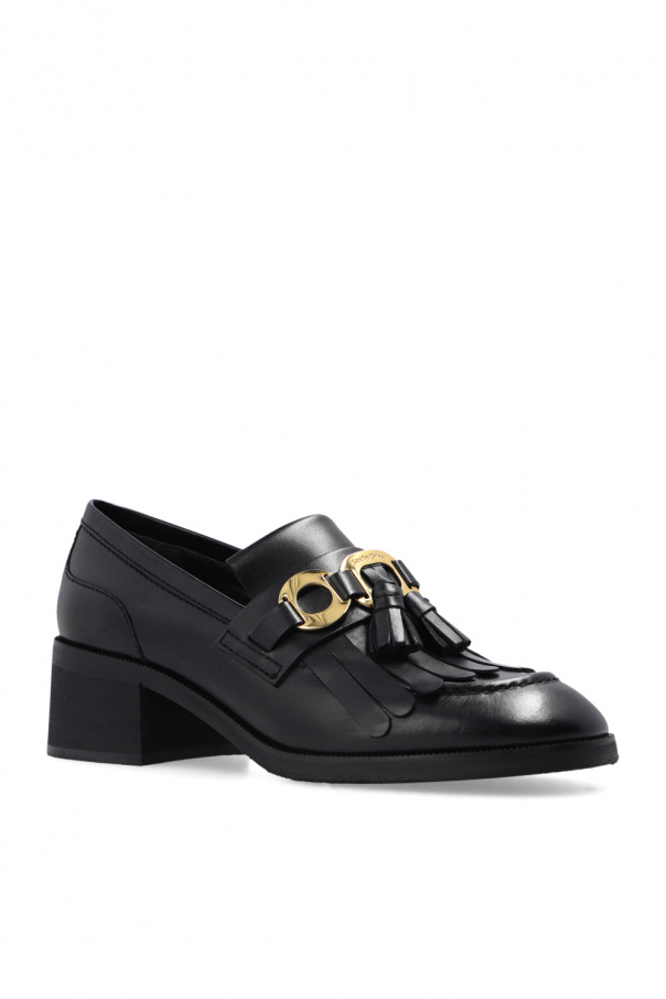 Black ‘Lyvi’ heeled shoes from See By Chloé. Crafted from leather, this pair features a black rubber sole and round logo appliqué with fringes in gold-tone and black.