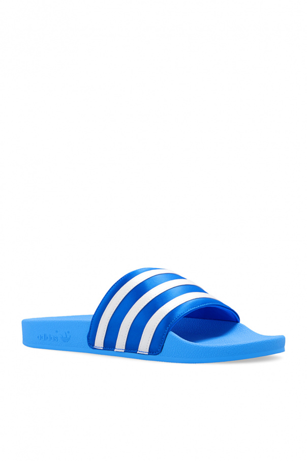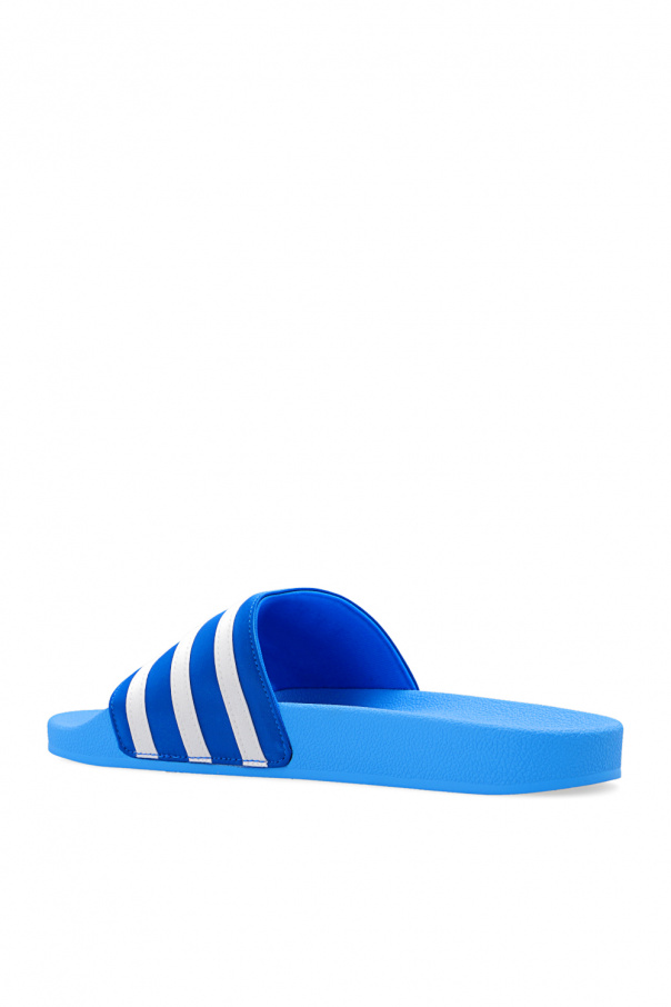 Blue and white ‘Adilette’ slides from ADIDAS Originals. Crafted from satin, this pair features the label’s signature three stripes in white and a blue rubber sole.