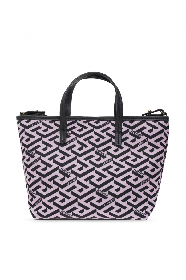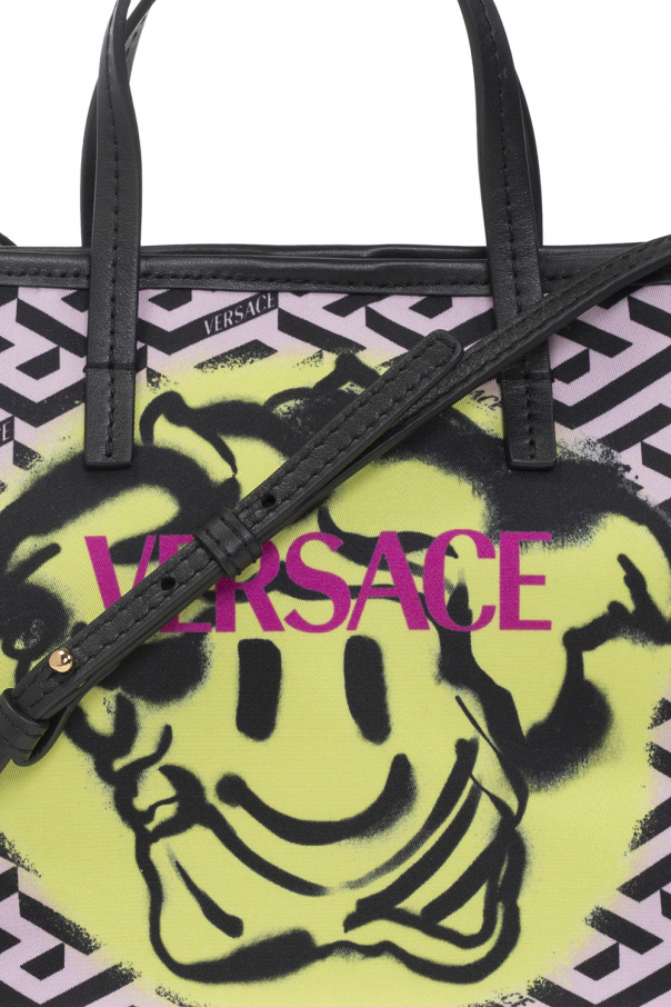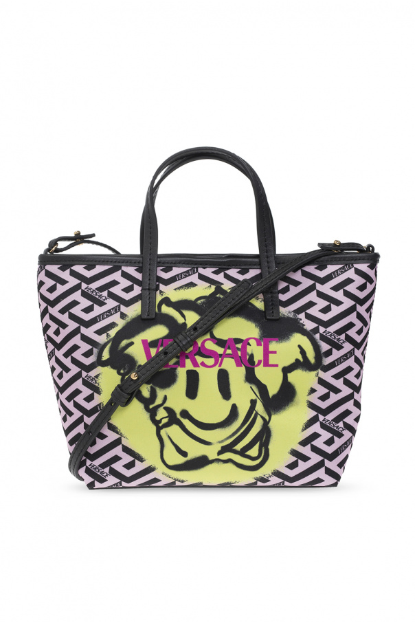 Pink and black ‘La Greca’ shoulder bag from Versace. Embellished with the brand's logo and a black, pink and greenish-yellow ‘Medusa Smiley’ print on the front, this design features a magnetic closure, leather trims, two half-round handles, a detachable and adjustable shoulder strap, gold-tone metal hardware and one internal compartment.