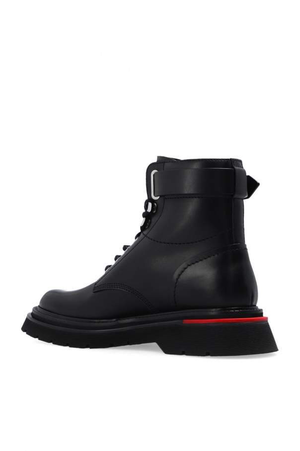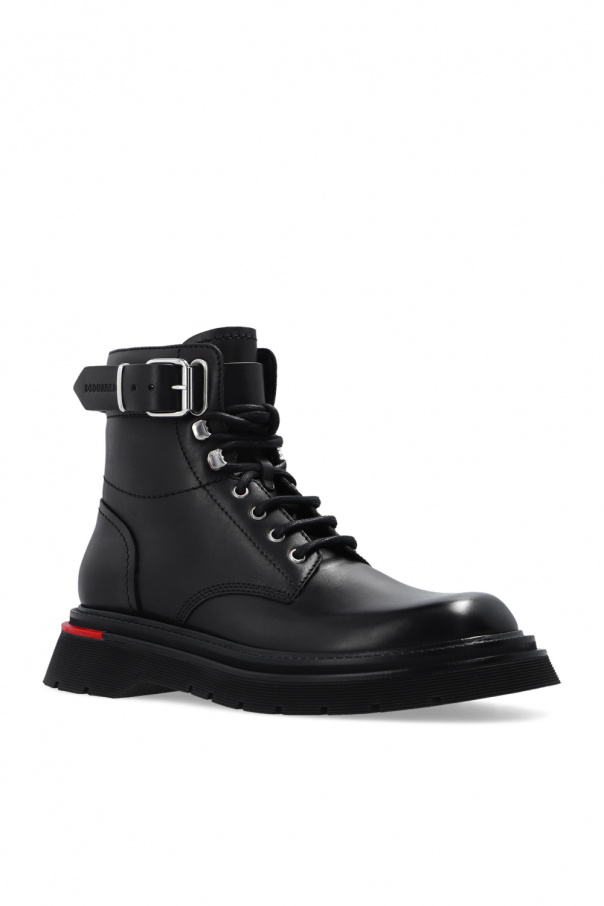 Black ‘Rider’ combat boots from Dsquared2. Made of calf leather, this lace-up model features a strap with a logo-embossed buckle and a black and red rubber sole at the base.