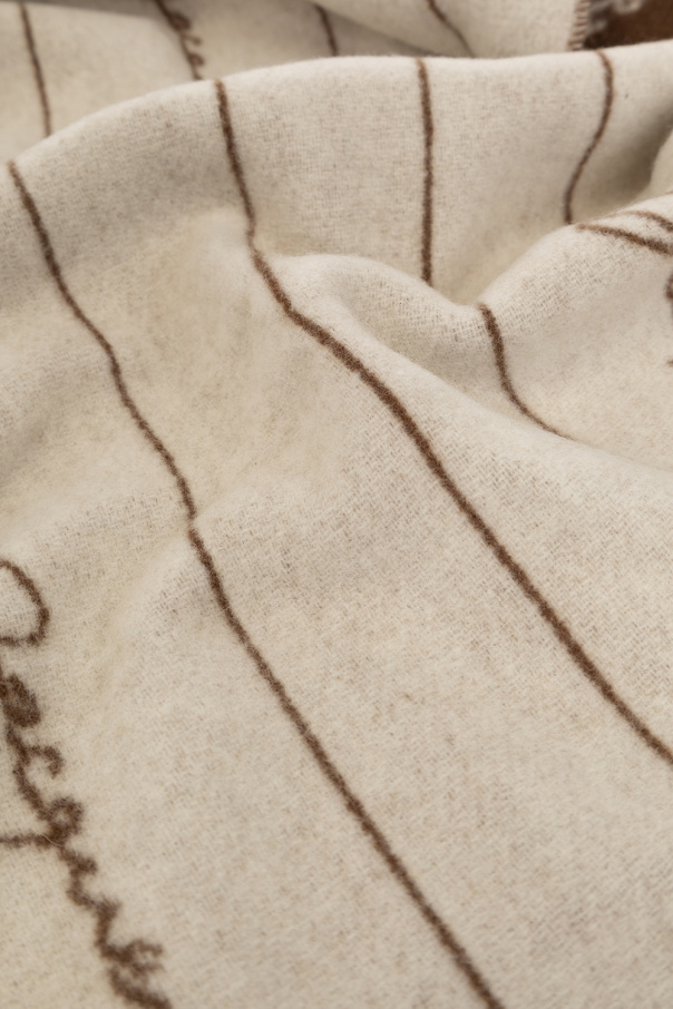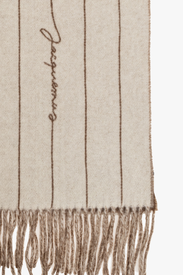 Brown and cream ‘Fio’ scarf from Jacquemus. Made of virgin wool, this design features a logo pattern and fringe edges.