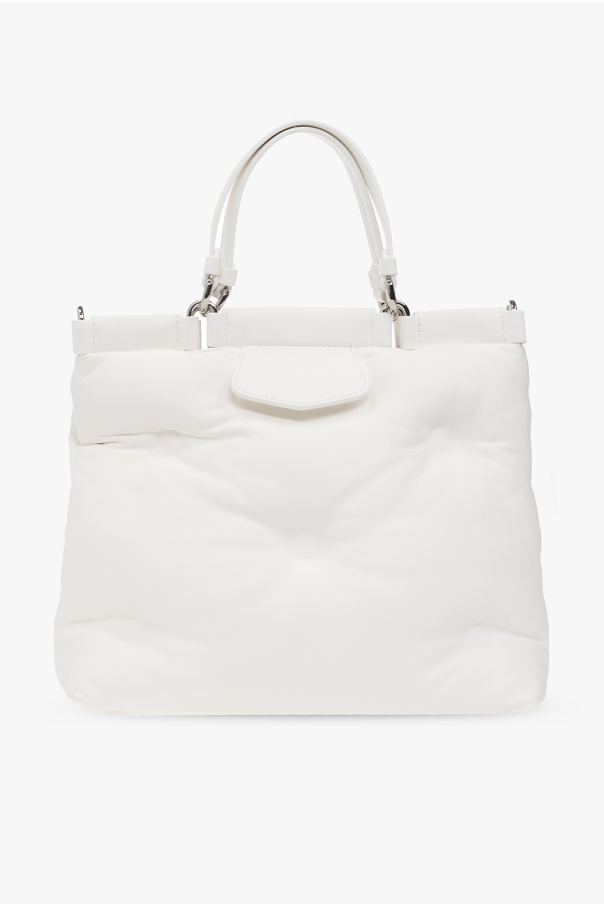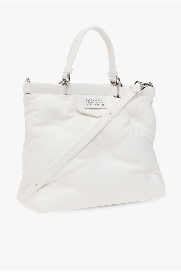 White ‘Glam Slam Small’ quilted shoulder bag from Maison Margiela. Crafted from lamb leather, this design features a magnetic fastener, a logo patch on the front, two half-round handles, silver-tone metal hardware, a detachable and adjustable strap and one internal compartment with a zip pocket.