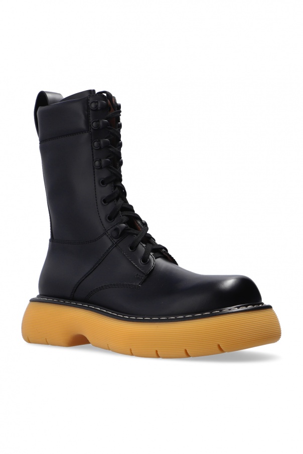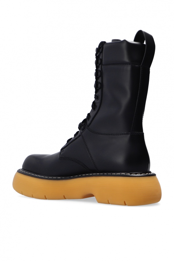 Black and beige ‘The Bounce’ platform shoes from Bottega Veneta. Crafted from calf leather, this model is complete with stitching details and a rubber sole.