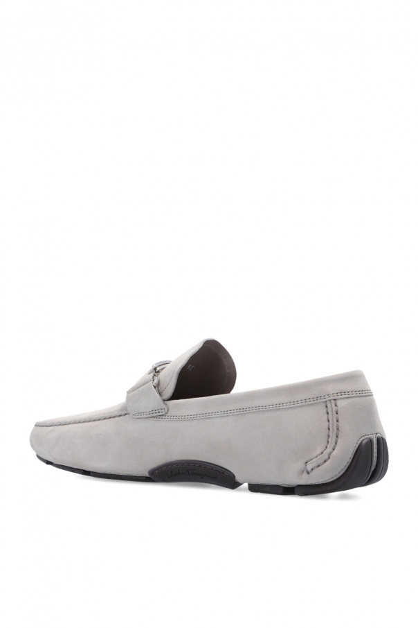 Light grey ‘Peter’ moccasins from Salvatore Ferragamo. Made of calf leather, this pair features a silver-tone metal appliqué, stitching details and dark brown rubber sole.