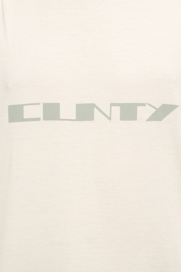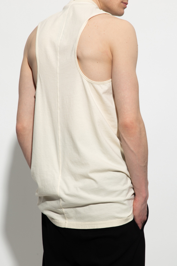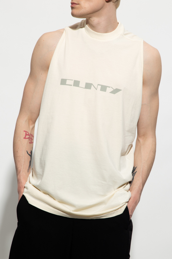 Cream sleeveless crewneck T-shirt from Rick Owens DRKSHDW. Made of cotton with a long fit, this style features a grey graphic print with the brand's logo on the front.