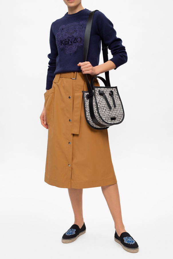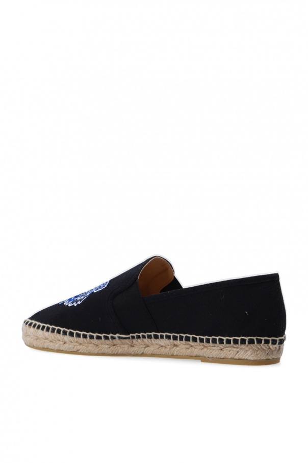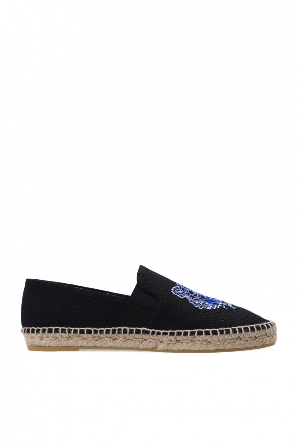 Black espadrilles from Kenzo. Embroidered with the signature colorful tiger head motif, this pair is complete with elastic tape on the sides and a beige rubber sole.