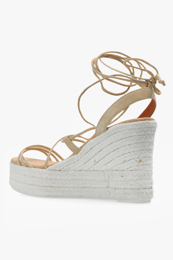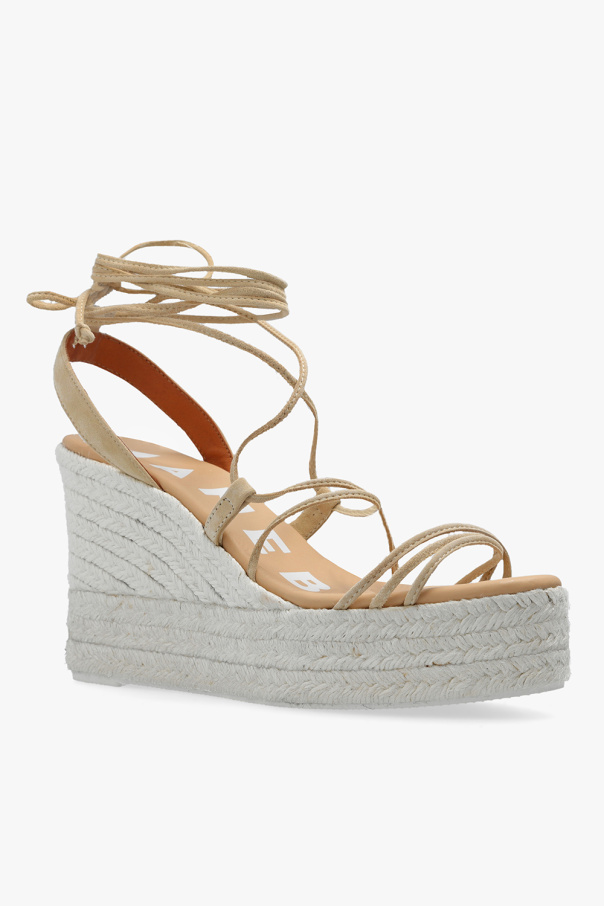 Beige wedge sandals from Manebi. Made of suede, this model sits on a natural jute sole with a thin layer of beige rubber and features a drawstring fastening at the ankle.