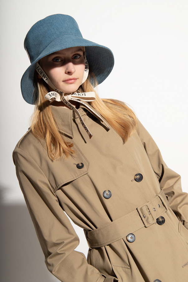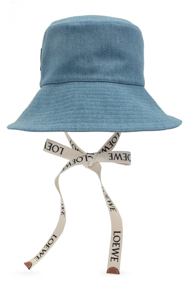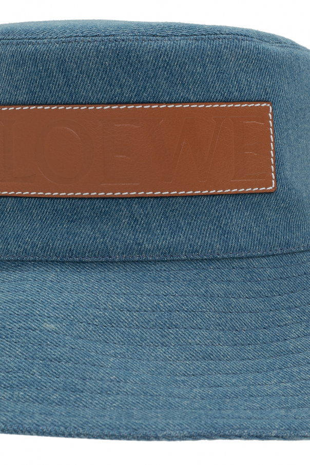 Blue denim hat from Loewe x Paula’s Ibiza. Made of cotton, this item showcases a brown patch with an embossed logo, decorative stitching details and canvas straps with a printed black logo.