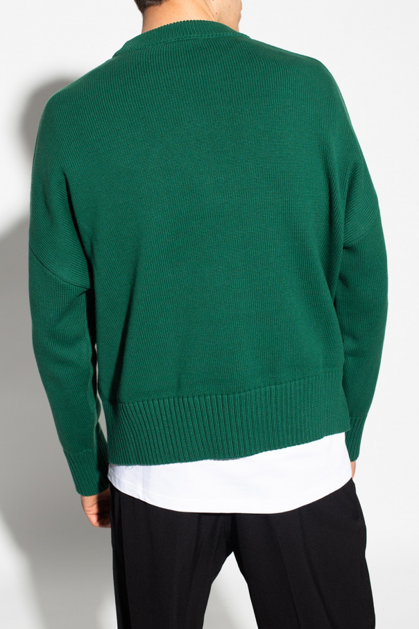 Green crewneck sweater from Ami Alexandre Mattiussi. Crafted from a cotton and wool blend, this jumper showcases an embroidered red logo and rib detailing on the edges.