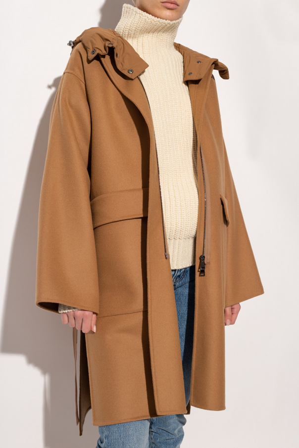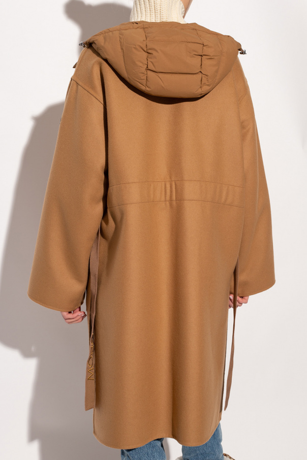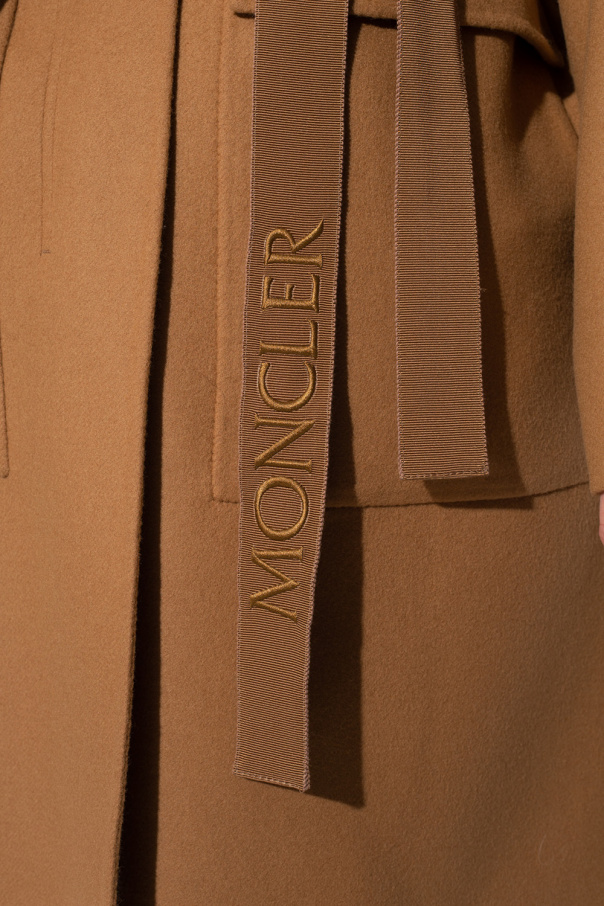 Beige and brown ‘Fleole’ coat from Moncler. Fastened with a zip and waist tie, this garment features a silver-tone logo appliqué, drawstring hood, two flap pockets and slits at the hem.