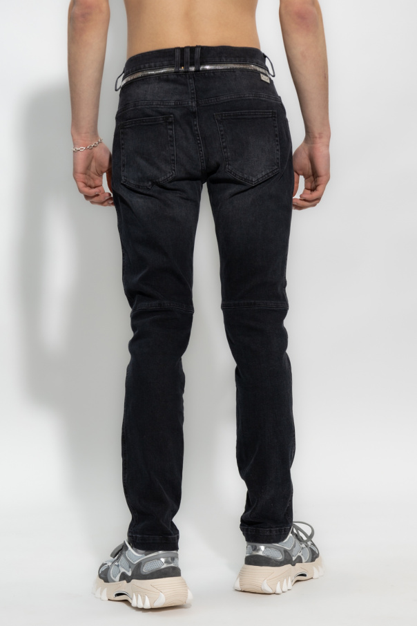 Black slim-fit jeans from Balmain. Made of cotton, this pair features a hidden zip fly with a button, four slip pockets and a decorative silver-tone zipper at the waist.