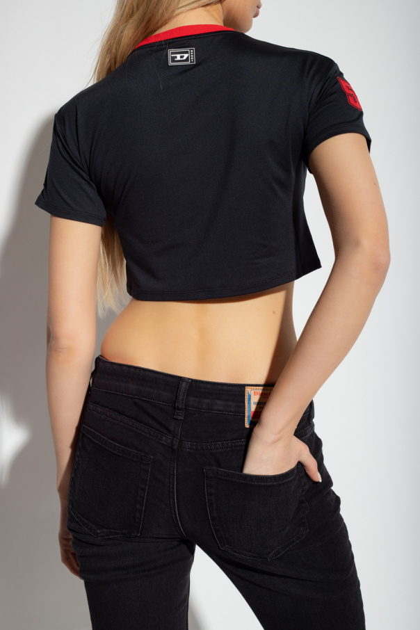 Black ‘AWTEE-BOURSTY’ cropped T-shirt from Diesel, the ‘Diesel Sport’ collection. This short sleeve design features logo print with rubber trims in red and white, logo patch at the back and round neck with red ribbed trims.