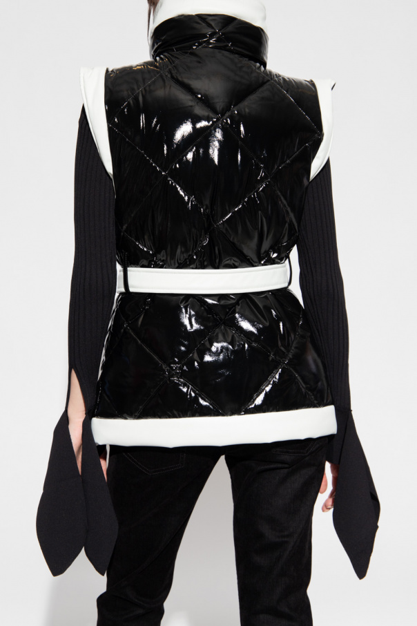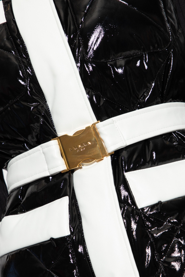 White and black vest with a stand collar from Balmain. Fastened with a zip, snaps and waist belt, this garment is complete with an embossed logo and four zip pockets.