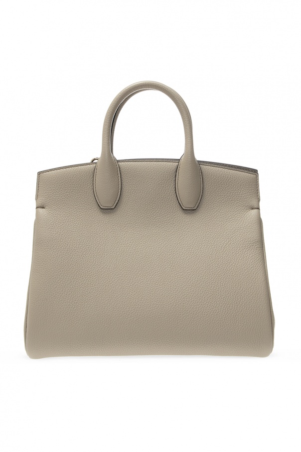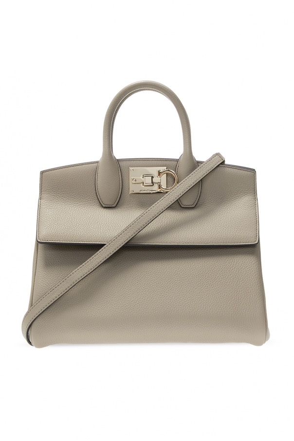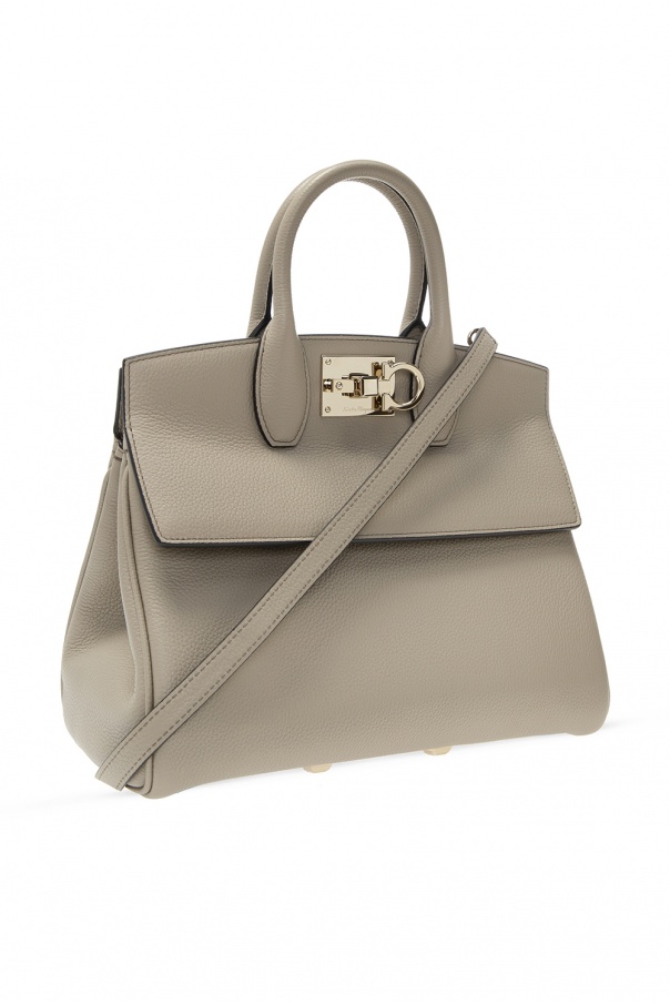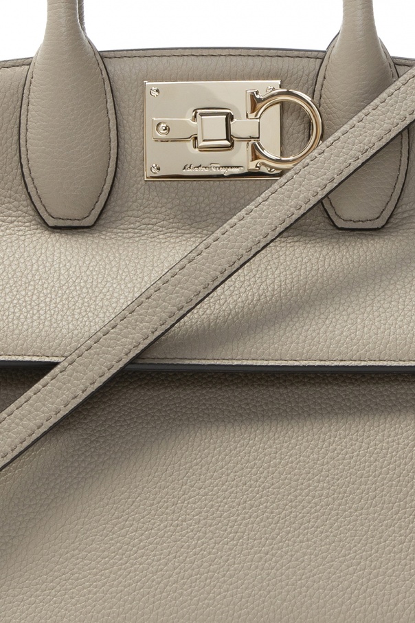 Grey ‘The Studio’ shoulder bag from Salvatore Ferragamo. Crafted from calf leather, this item fastens with a decorative buckle with a logo. It is complete with a front zip pocket, two half-round handles, detachable and adjustable shoulder strap, gold-tone metal hardware, black lining and one internal compartment with one slip pocket and a removable zipped pouch.
