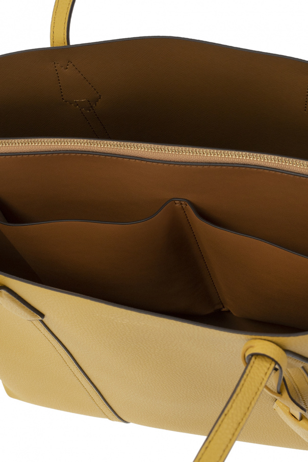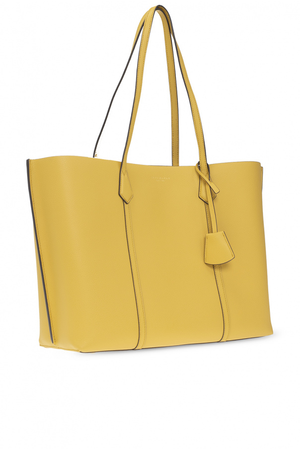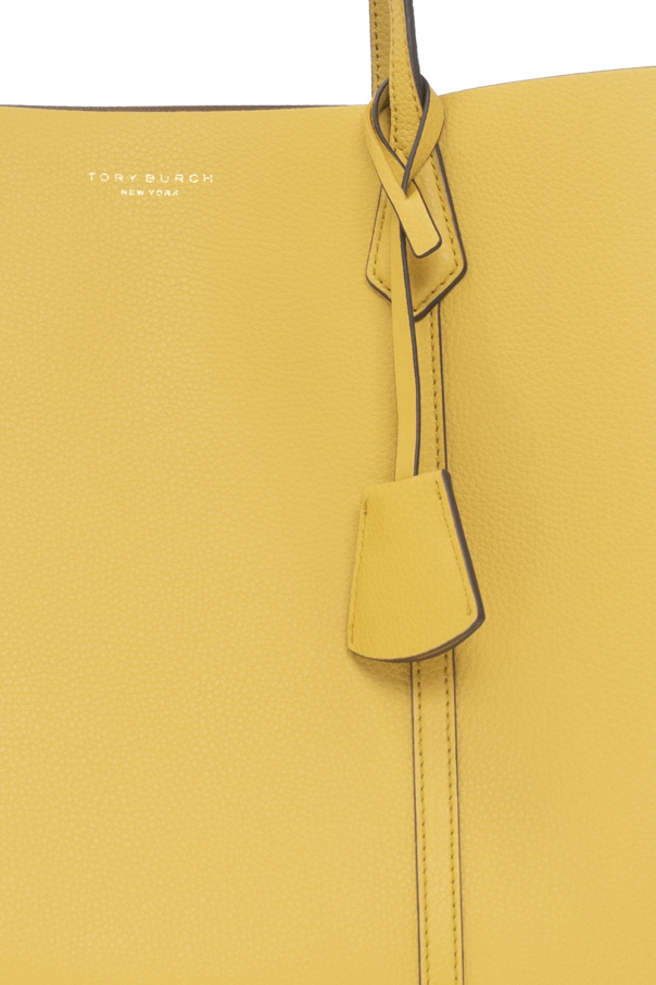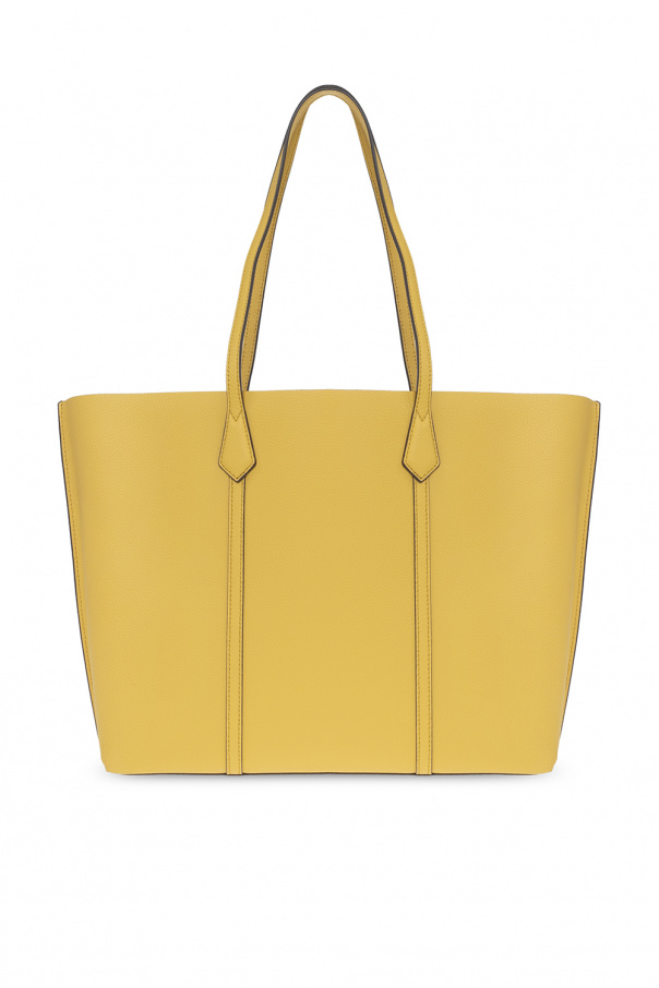 Yellow ‘Perry’ shopper bag from Tory Burch. Crafted from leather, this design features a gold-tone logo print on the front, two half-round straps, gold-tone metal hardware and an interior with two separate compartments, one zip pocket and three slip pockets.