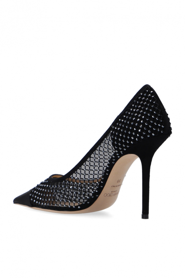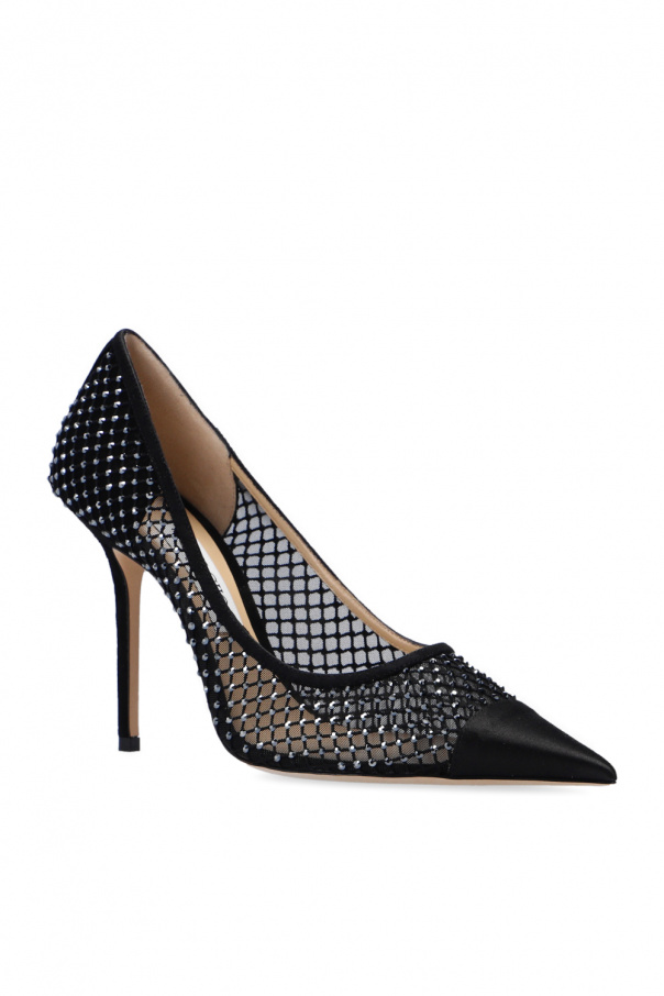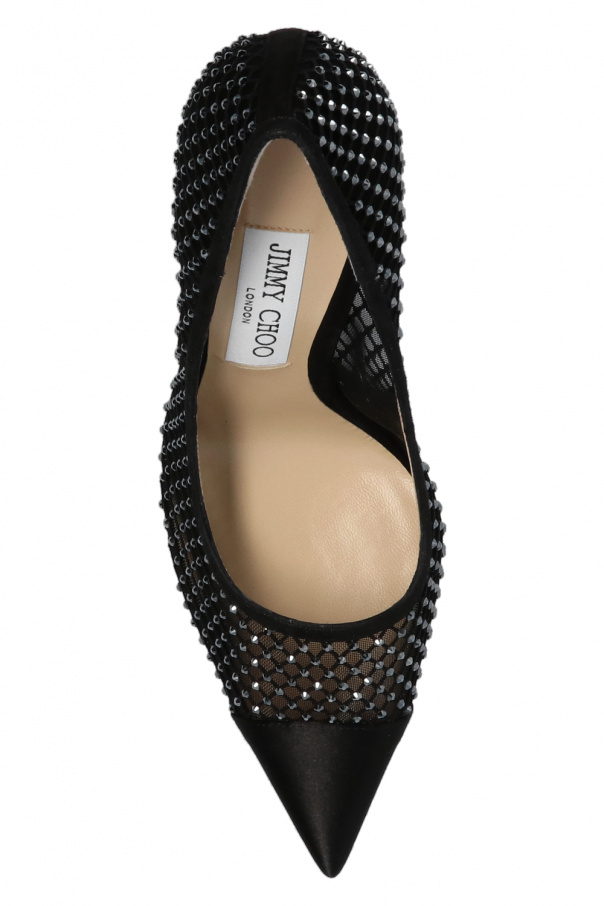 Black ‘Love’ pumps from Jimmy Choo. Embellished with sequins, this transparent pair boasts a pointed toe silhouette with leather trims and a beige leather sole.