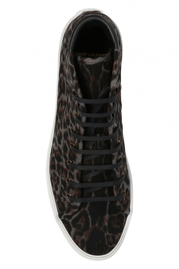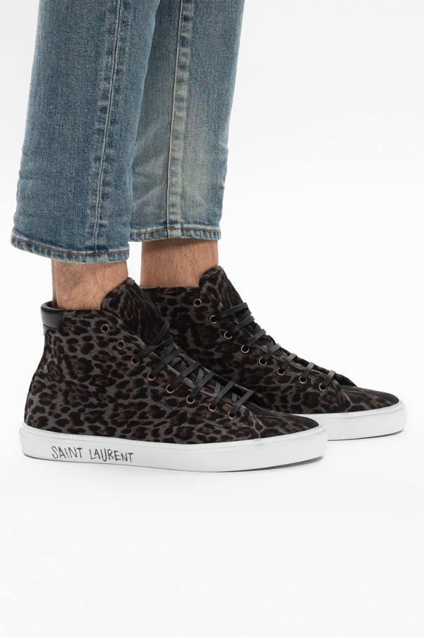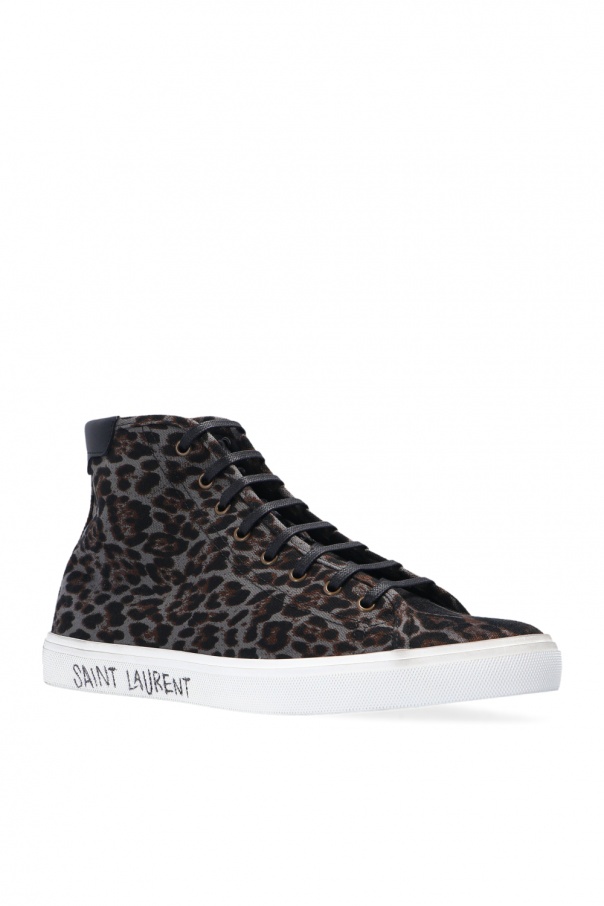 Grey, black and brown ‘Malibu’ sneakers from Saint Laurent. Crafted in leopard-printed canvas, this high-top pair is set on a white rubber sole with printed black lettering of the name of the brand and features lace-up fastening and leather heel counter with gold-tone logo print.