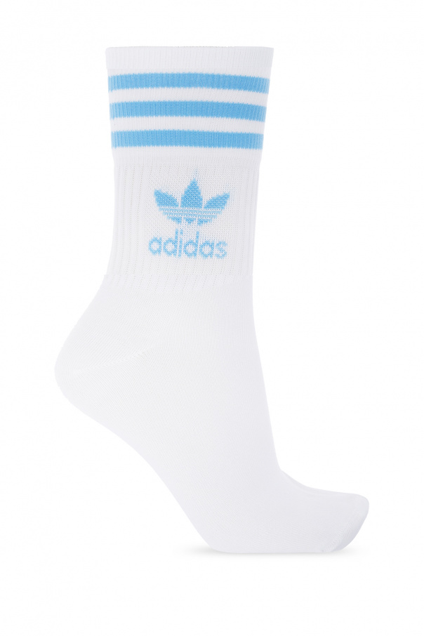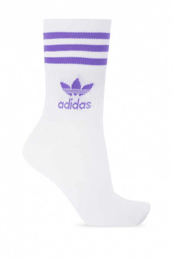 3-pack of white socks from ADIDAS Originals. Crafted from cotton and recycled materials, each pair features the label’s signature embroidered three stripes and a logo in purple, pink and blue.