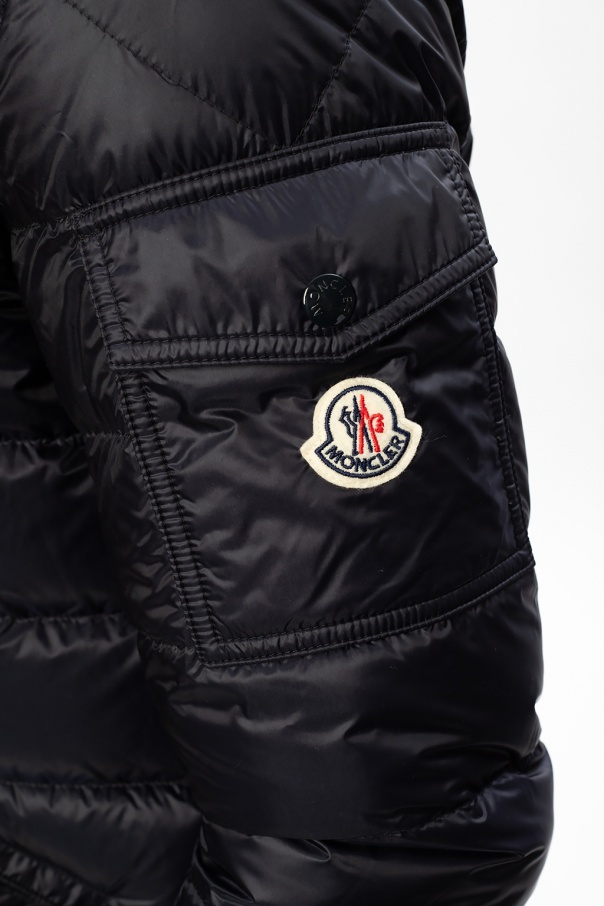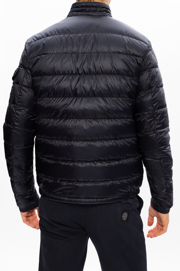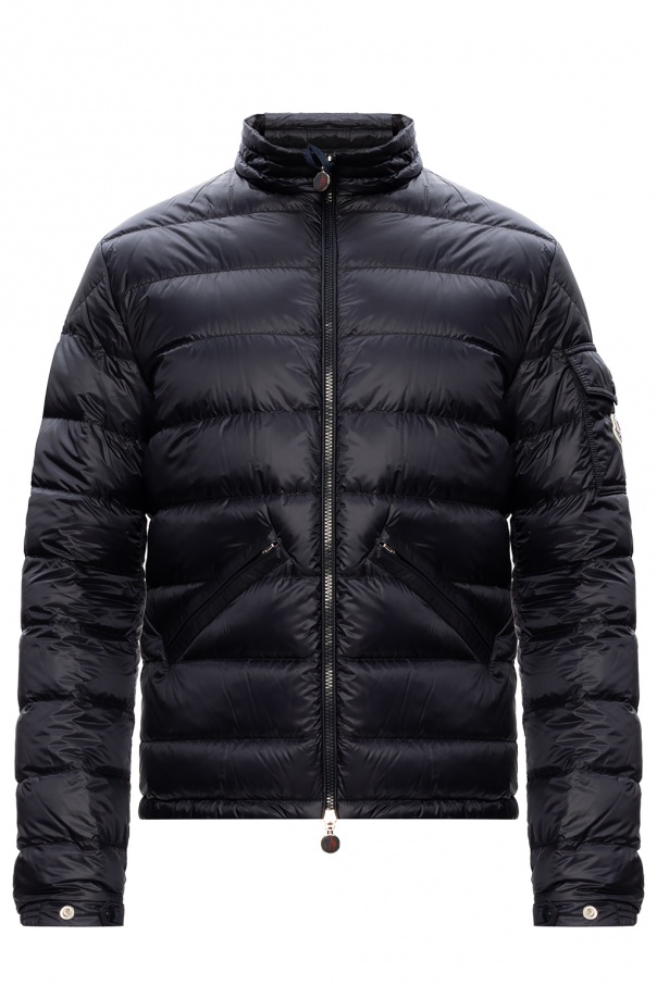 Navy blue ‘Agay’ quilted jacket from Moncler. Padded with goose down, this wintry design fastens via a two-way zip and employs two zipped pockets on the front and long sleeves, one of which has a snap-fastened flap pocket and a colourful logo patch.