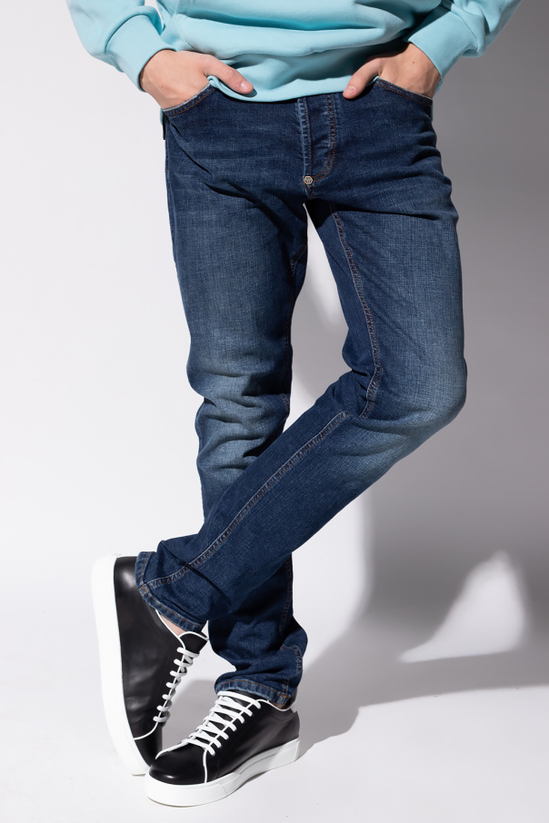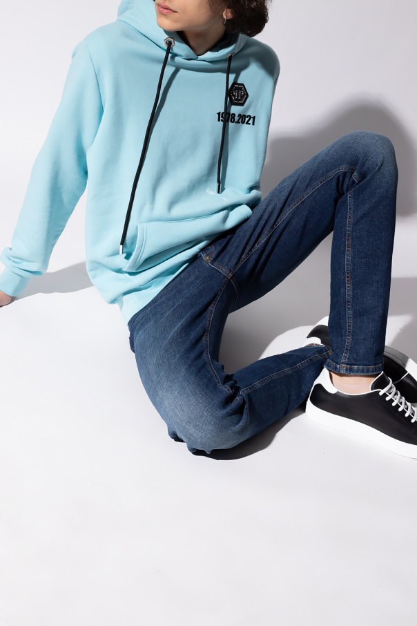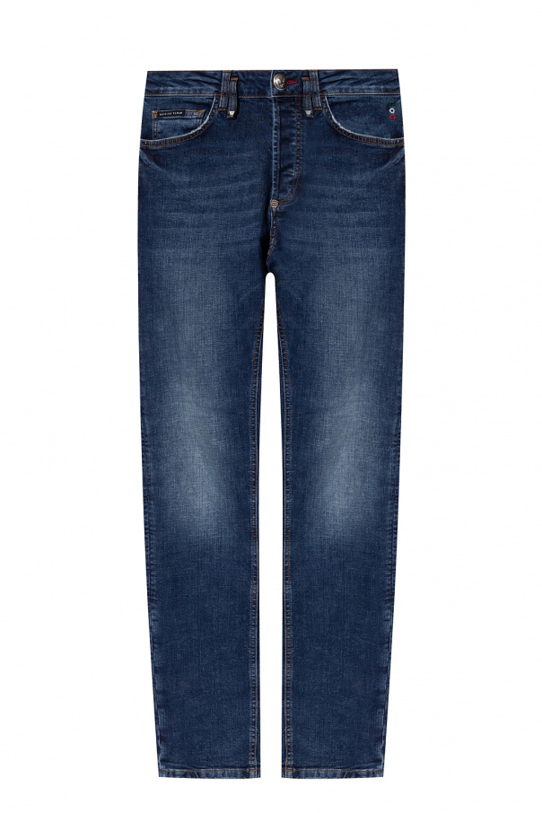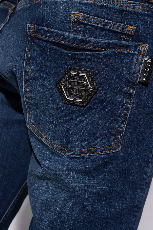 Dark blue jeans from Philipp Plein. Falling down with straight legs, this pair features button fastenings, an appliqué with a tactile logo and six pockets: three on the front and three at the back.