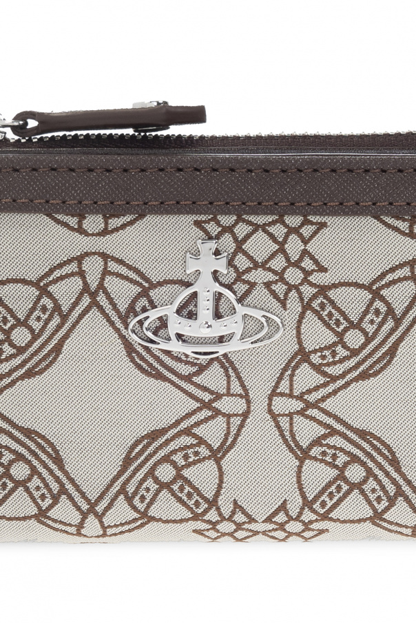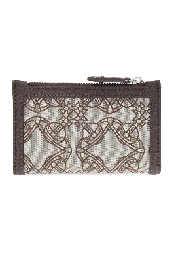 Cream and brown ‘Logo’ wallet from Vivienne Westwood. Crafted from recycled materials and vegan leather, this design secures with a snap and zip and showcases an application, an embroidered logo, silver-tone metal hardware and six card slots and two pockets inside.