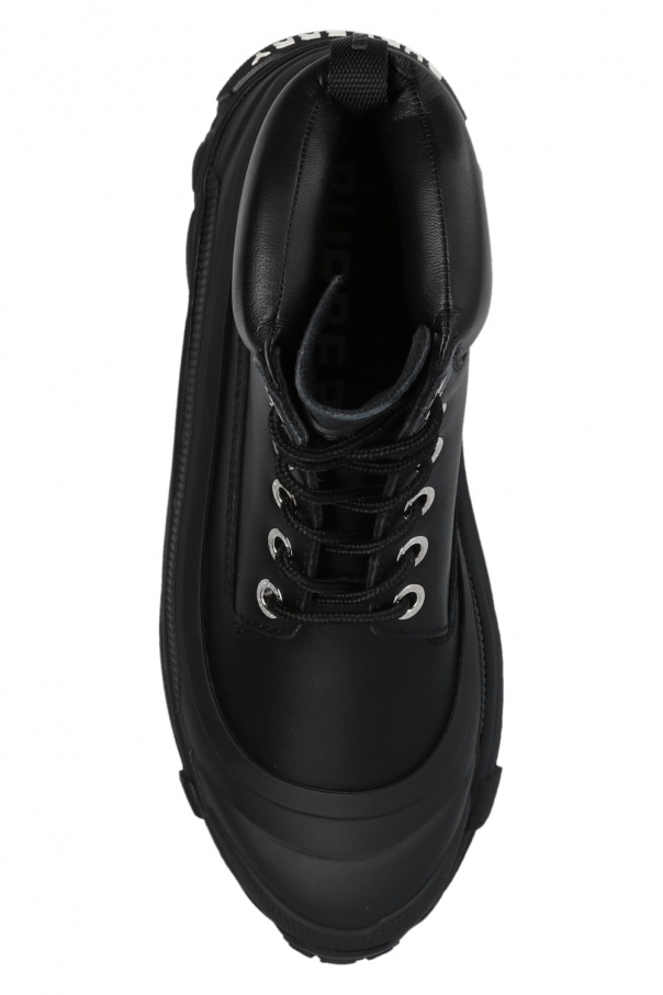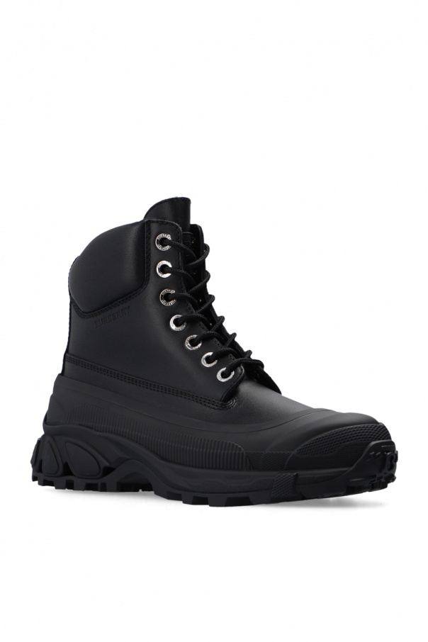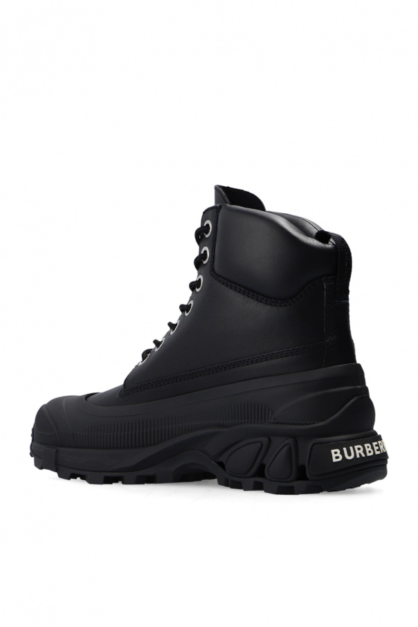 Black ankle boots from Burberry. Crafted from leather, this lace-up model sits on a black rubber sole and showcases tactile white logo lettering on the back.