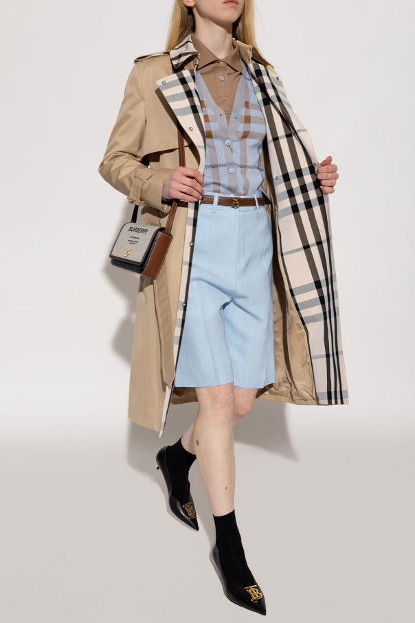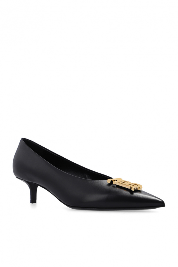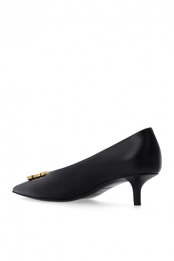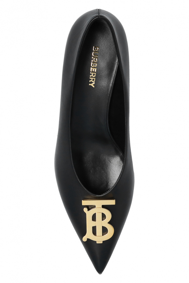 Black pumps from Burberry. Made of calf leather, this model sits on a black leather sole and features a pointed toe silhouette with gold-tone brass logo hardware on the front.