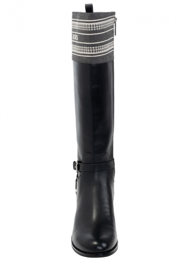 Black ‘Aldridge’ knee-high boots from Michael Michael Kors. Crafted from leather and fabric, this model sits on a black rubber sole and showcases a zip fastening, an almond-shaped toe and embroidered logo pattern in black and white.