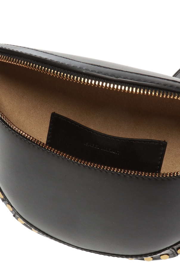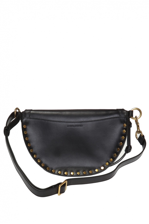 Black 'Skano' belt bag from Isabel Marant. Made of cow leather. Fastened with zip. Embellished with antiqued gold-tone studs. It features logo-embossed slip pocket on the rear, an adjustable waist belt and interior with 1 compartment and beige lining inside.