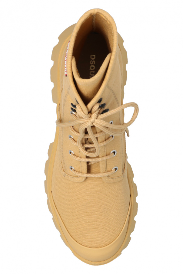 Beige ‘Tank’ combat boots from Dsquared2. Emblazoned with a logo patch and raised branding, this lace-up model sits on a beige tread rubber sole.