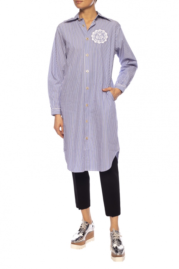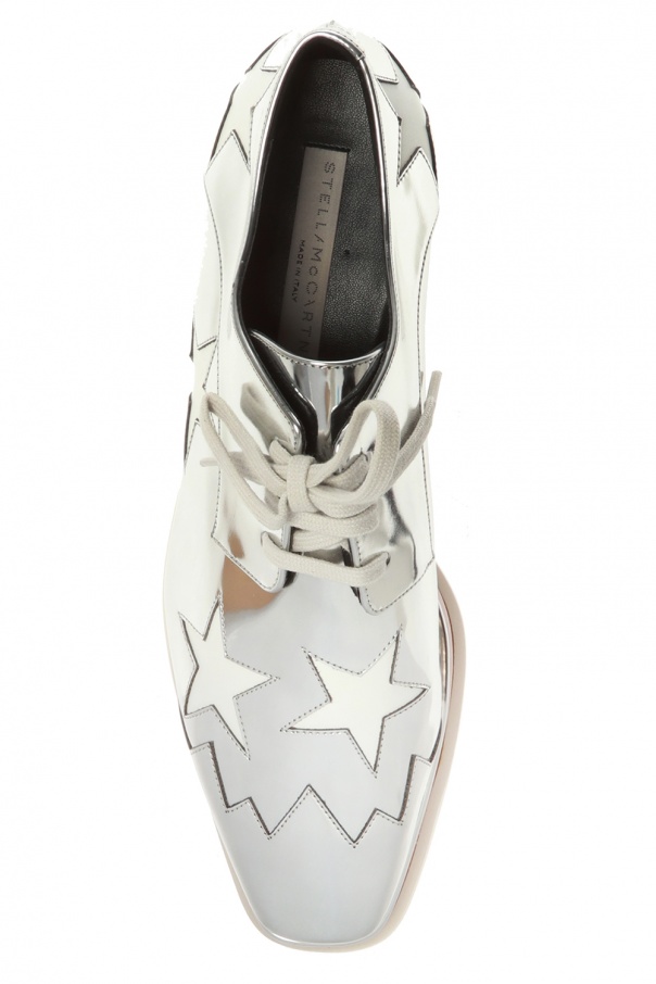 Silver-tone 'Elyse' lace-up platform shoes from Stella McCartney. Made of faux-suede. Embellished with signature motif of stars in white. Seated on a white sole crafted from foam rubber and sustainable wood.