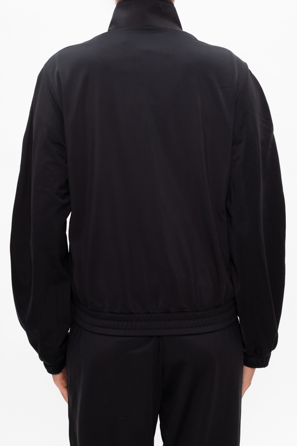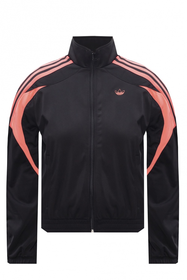 Black track jacket from ADIDAS Originals. Sporting Adidas' signature three stripes and trefoil logo embroidery in pink, this style features high neckline, zip fastening, two zipped pockets and ribbed finishes at the bottom hem and cuffs.