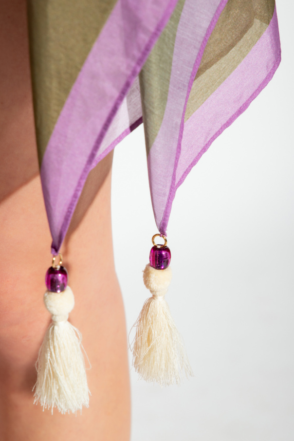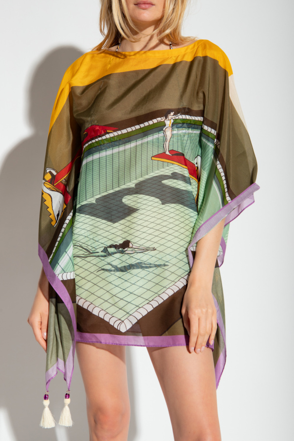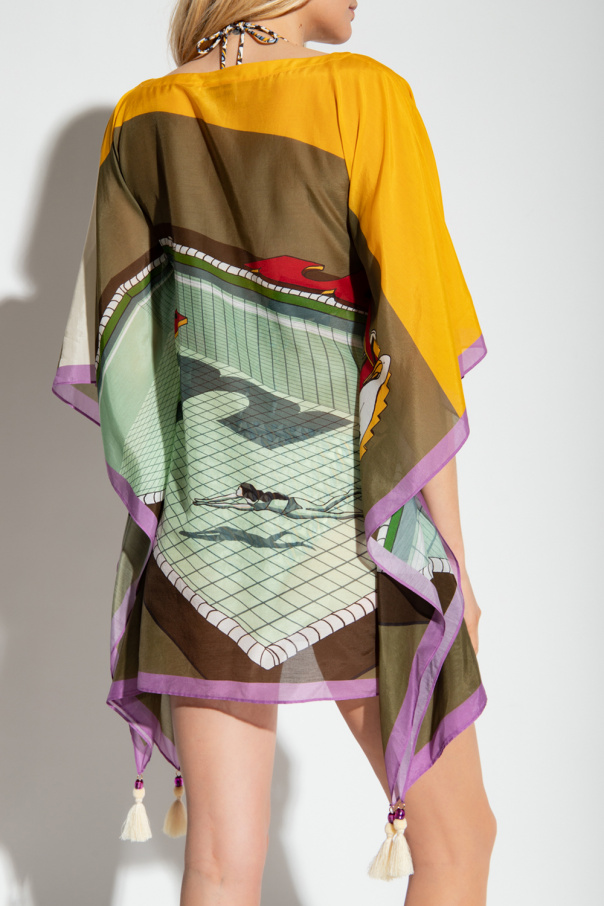 Multicoloured beach top from Tory Burch. Crafted from a cotton and silk blend, this style features a graphic print and distinctive fringes.