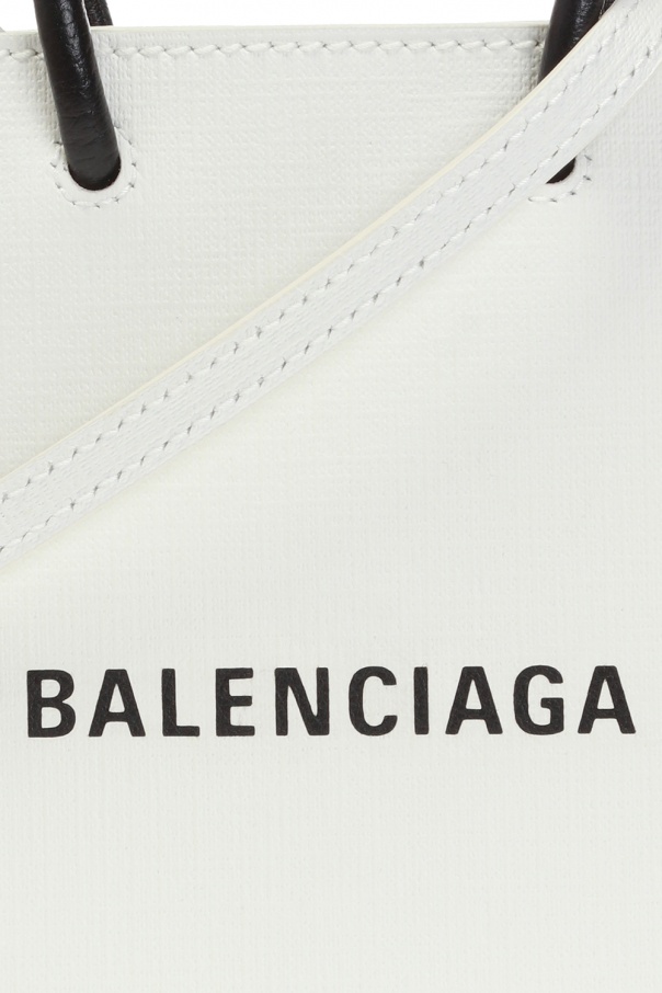 White ‘Shopping’ smartphone case from Balenciaga. Made of calf leather, this item secures with a snap and showcases a black logo print on the front, two half-round black handles, an adjustable shoulder strap, silver-tone metal hardware and one internal compartment with one slip pocket.