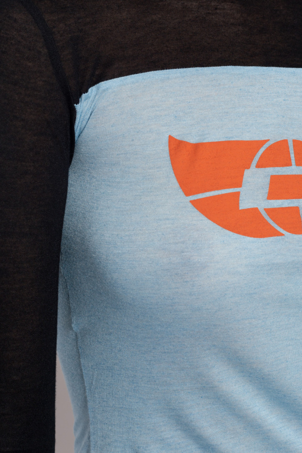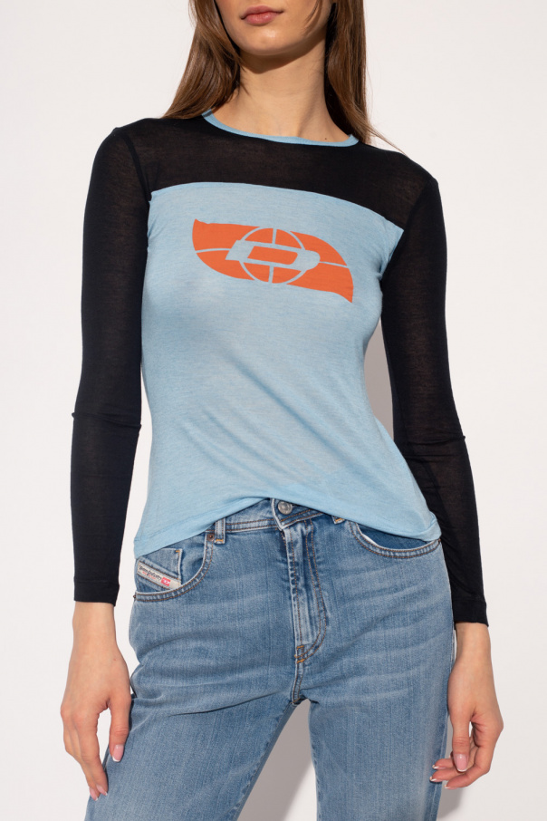 Light blue and black ‘T-Ina’ T-shirt from Diesel. Embellished with an orange logo print on the front, this style features long sleeves and an elasticated collar with light blue piping.