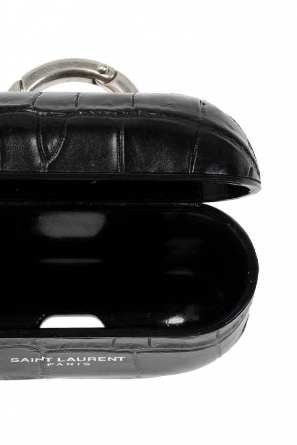Black AirPods Pro case from Saint Laurent. Crafted from leather with a crocodile skin effect, this item features a silver-tone logo print on the front and a silver-tone key chain loop with an embossed logo.