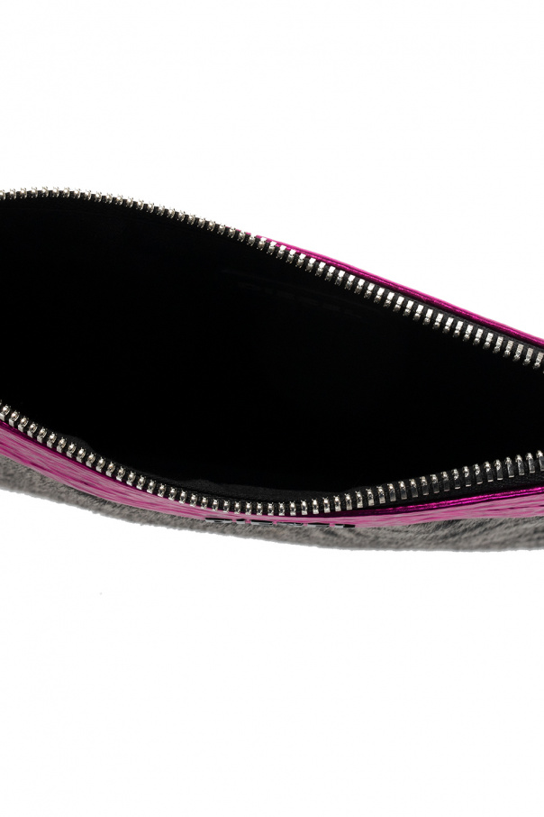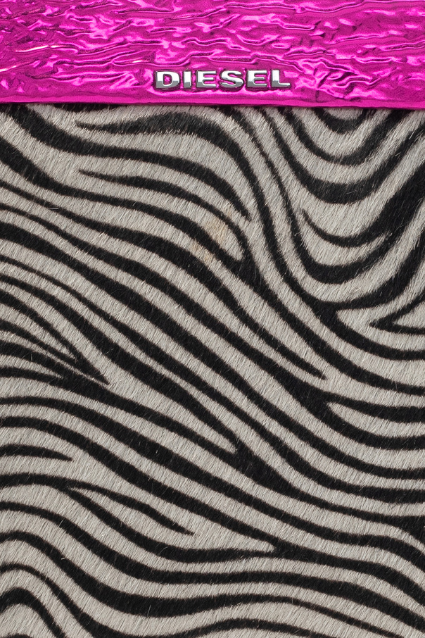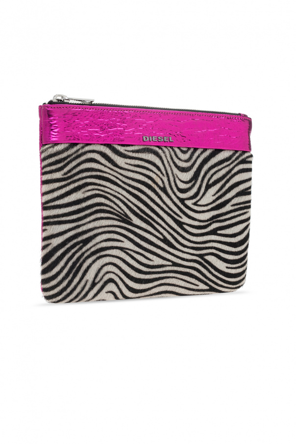 Pink, cream and black ‘Lusina II’ clutch from Diesel. Crafted from metallic faux fur printed with an animal motif, this design is complete with a zip fastening, metal logo appliqué in silver-tone and one internal compartment.