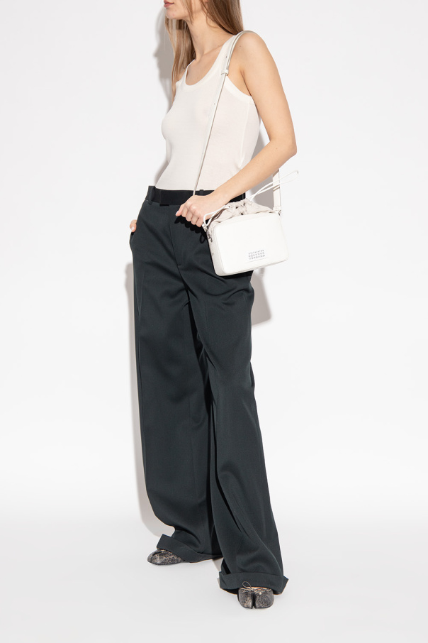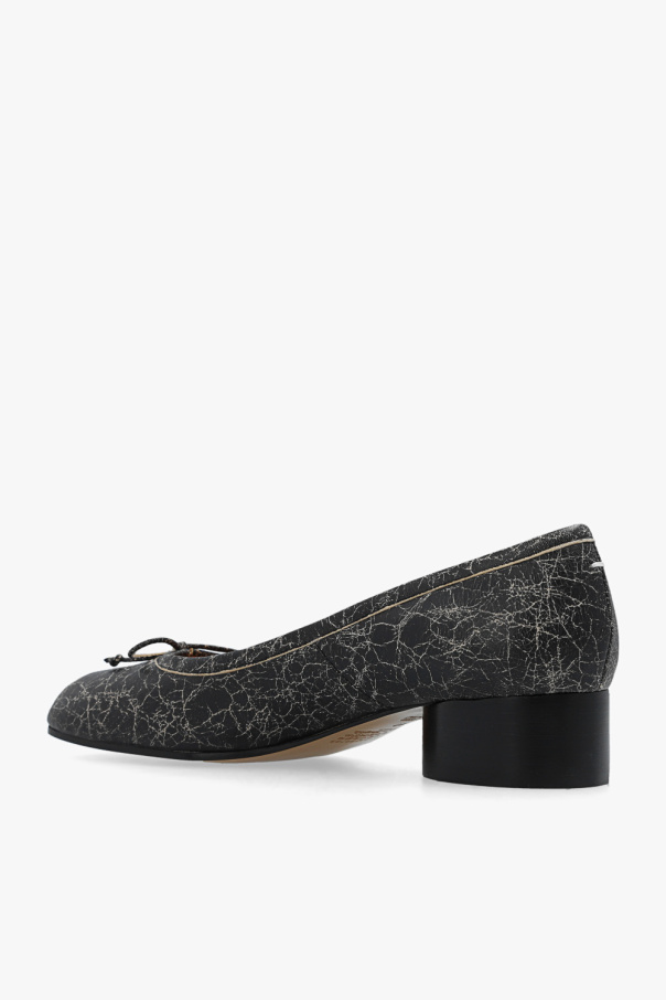 Black 'Tabi' pumps from Maison Margiela. Crafted from textured leather with a signature split-toed design, this model features a thin bow on the front and a beige leather sole at the base.