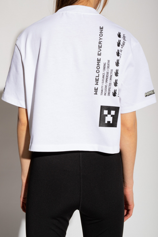 White crewneck T-shirt from Lacoste x Minecraft. Made of cotton with a cropped fit, this style features a black and grey graphic print accompanied by a logo patch and logo embroidery.