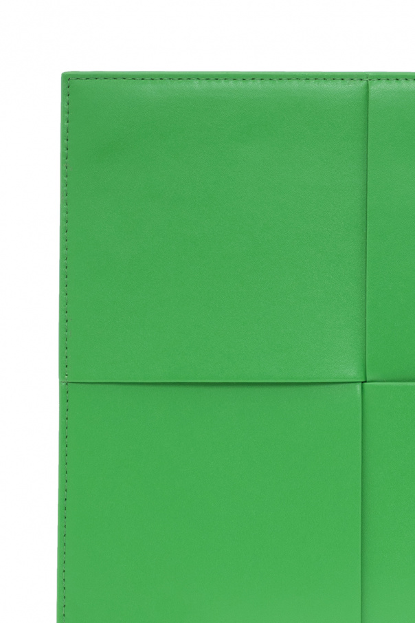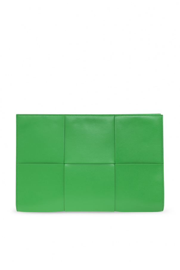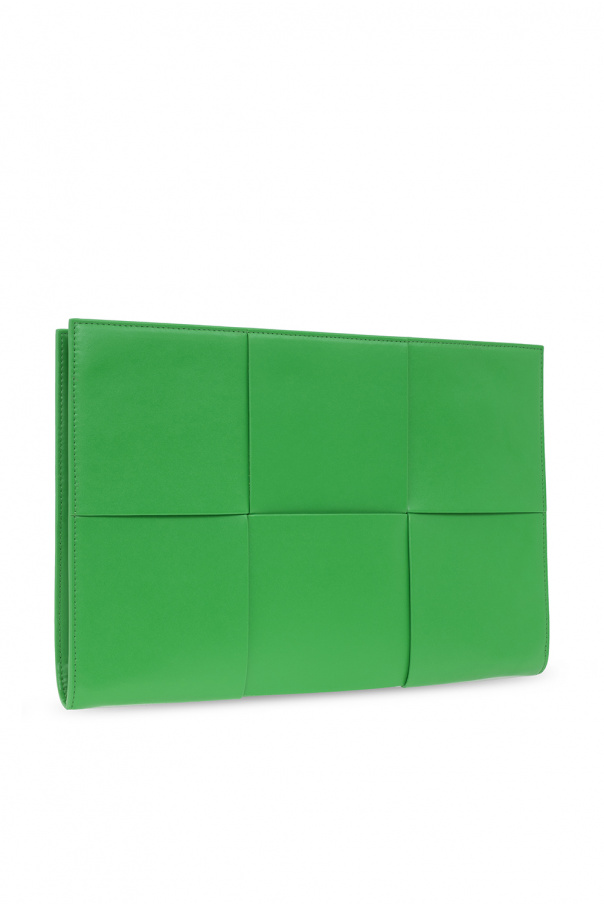 Green ‘Arco Medium’ briefcase from Bottega Veneta. Crafted from calf leather accentuated with the brand's iconic ‘Intreccio’ weave, this design features a two-way zip fastening, silver-tone metal hardware and a suede-clad interior with a zip pocket.