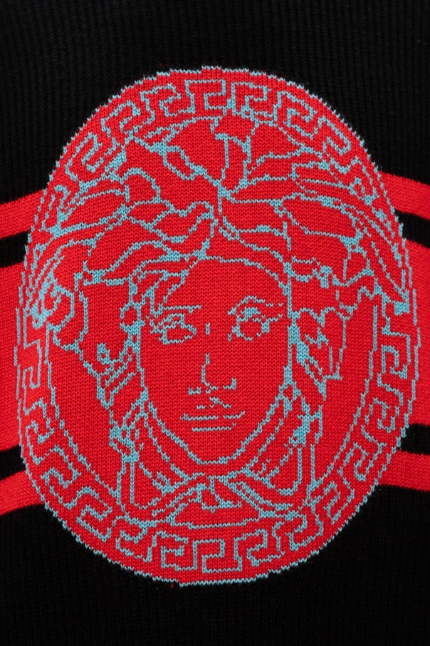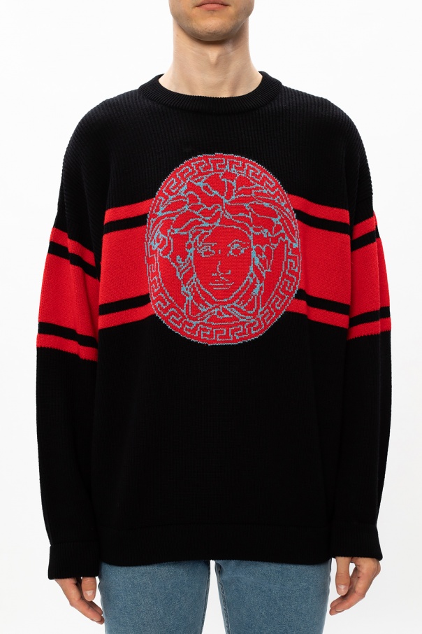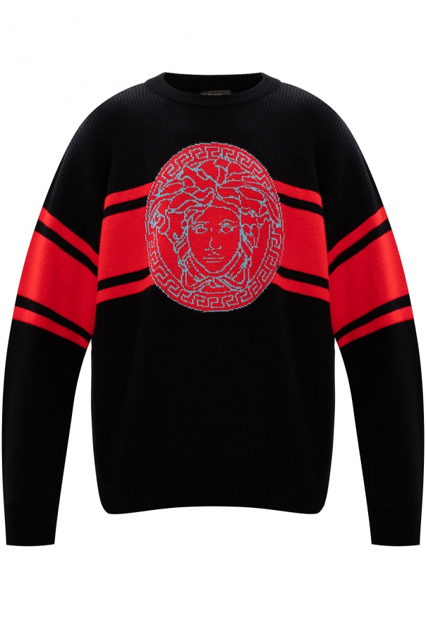Black sweater from Versace. Crafted from wool with a rib-knit structure and ribbed trims, this item is decorated with red stripes and a blue logo.